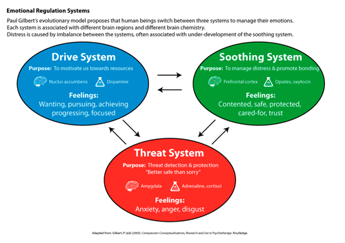 CFT proposes that human beings have three systems for managing their emotional states. Each system has different motivations, foci of attention, thoughts, emotions, and body feelings. Each system is associated with different parts of the brain, and with different neurochemistry: