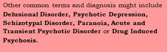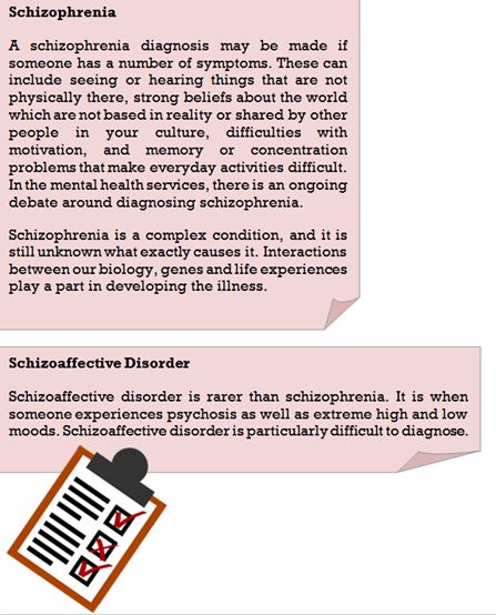 People who have experience psychosis might receive one of a range of diagnoses. Schizophrenia is one of the most well known of these, but other related diagnoses might include Schizoaffective Disorder, Delusional Disorder, Psychotic Depression, Bipolar Disorder or Schizotypal Disorder. Other terms like ‘Paranoia’ or ‘Acute and Transient Psychotic Disorder’ or ‘Drug Induced Psychosis’ might also be used.