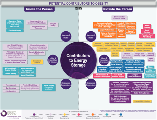 The Obesity Society created the image below to show the many factors that can contribute to obesity. Many of these factors are either partially or completely outside of a person’s control.